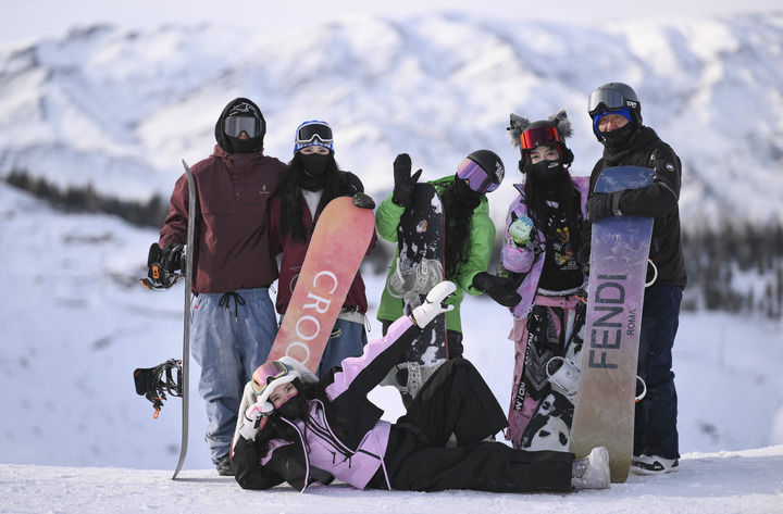 2025年1月28日,来自浙江的“95后”姑娘张琦彬(前)与一起滑雪过年的同伴们在新疆阿勒泰将军山国际滑雪度假区合影。新华社记者 胡虎虎 摄