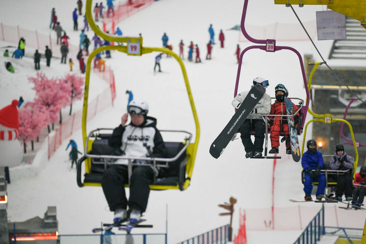 2025年1月12日,在成都热雪奇迹室内滑雪场,滑雪爱好者搭乘索道前往高级道。新华社记者 胥冰洁 摄